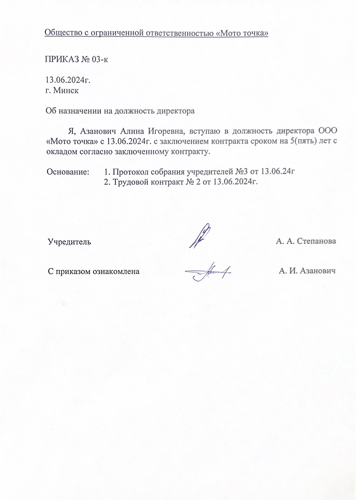 Юридический и почтовый адрес: 223035, РБ, Минский район, а.г. Ратомка, ул. Заславская, 13, каб.1-6, УНП693330279 р/с BY90ALFA30122E95570010270000 в ЗАО «Альфа-Банк», ОКПО 508549606000, БИК ALFABY2X +37529-117-17-15, mototochka.by. Mototochka.by@yandex.ru Директор Азанович Алина Игоревна действует на основании устава, приказ о назначении №3-к от 13.06.2024г